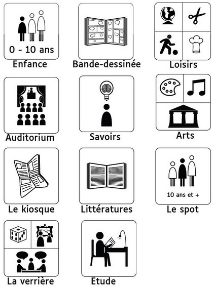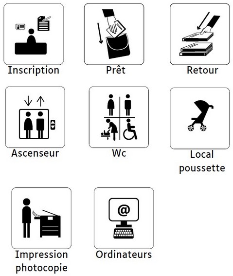 Les pictogrammes de l'Espace Média sont inspirés de ceux réalisés par l’Agence du Livre et Lecture en Bretagne. Ils reprennent également les visuels normalisés déjà présents dans notre univers quotidien, espace urbain, équipements publics, afin que le repérage visuel soit facilité (ex.